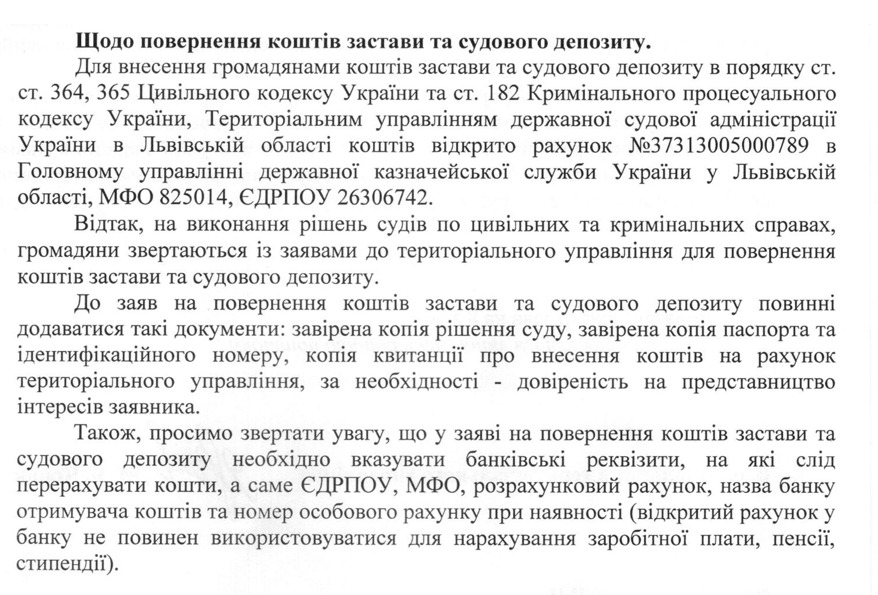 На підставі Рішення Городоцького районного суду Львівської області від 01.03.2012 р. по справі №2-3467/11, що набрало законної сили, прошу перерахувати мені кошти в сумі 5000, 00 грн. (п’ять тисяч гривень нуль копійок), внесені Петренко Оленою Степанівною згідно квитанції №1/13 від 01.01.2012 на депозитний рахунок Територіального управління державної судової адміністрації України у Львівській області як вартість ¼ частки квартири, що знаходиться у м. Городок, вул. Чорновола, 16/12.