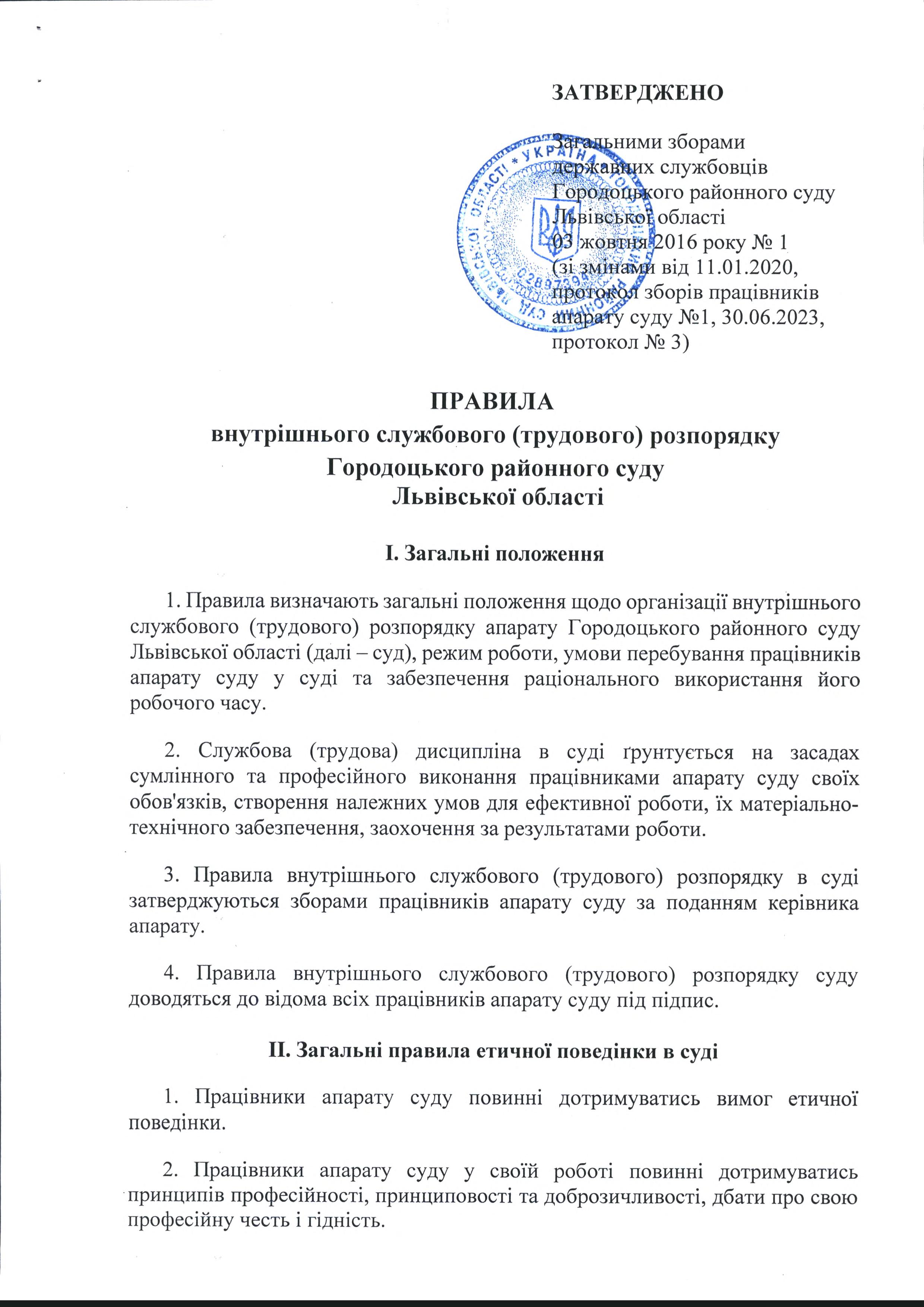 ПРАВИЛА внутрішнього службового (трудового) розпорядку Городоцького районного суду Львівської області