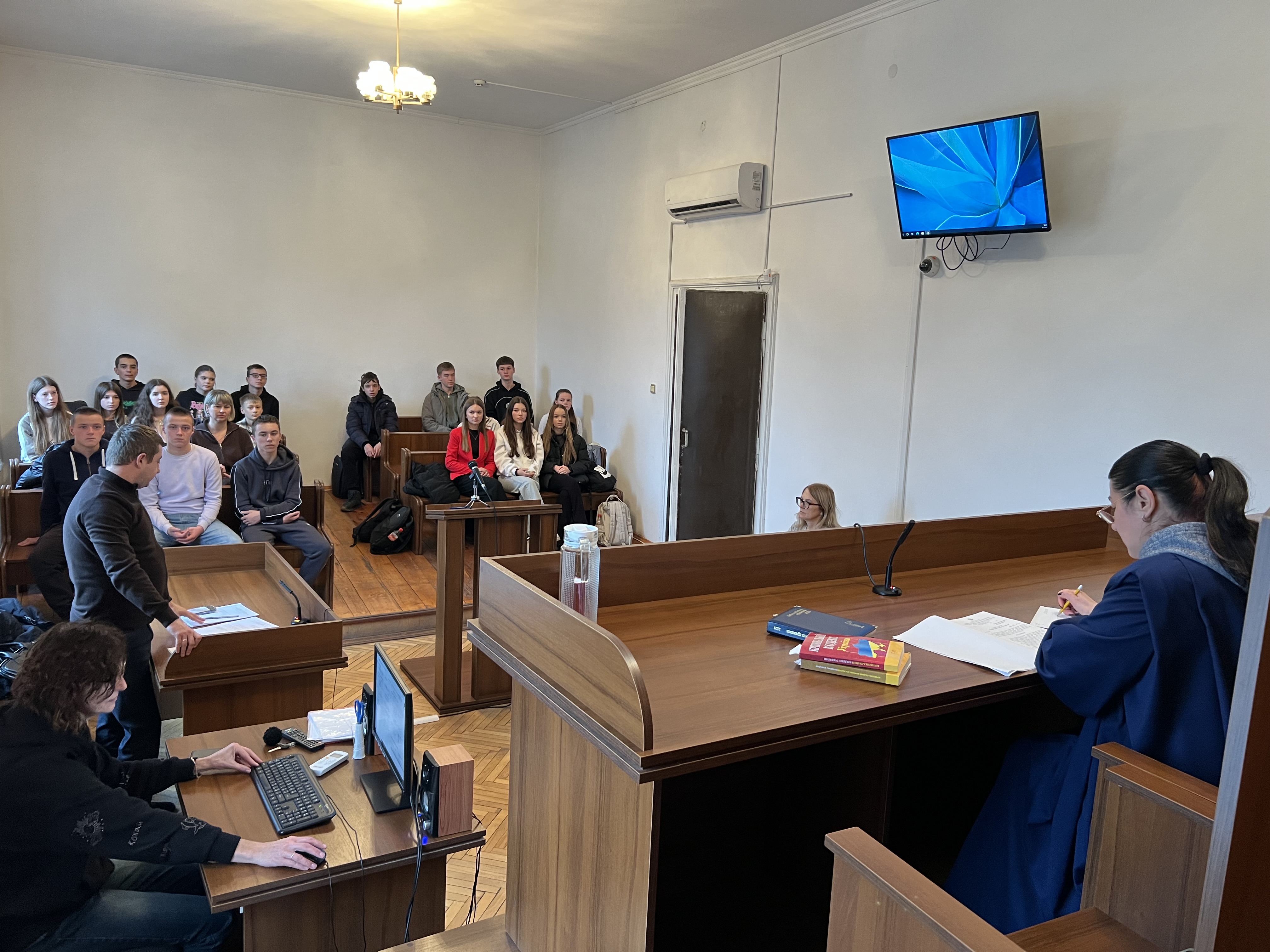 Керівник апарату розповіла про роботу суду в цілому, ознайомила школярів із структурою та діяльністю суду, роботою суддів та працівників апарату. Розповіла їм щодо адміністративної відповідальності неповнолітніх та їх батьків, про різноманітні справи які перебували(перебувають) на розгляді в суді. Також, відповіла на запитання, які цікавили учнів.